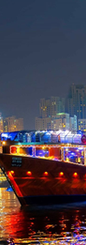 Experience the magic of Dubai by night with a captivating dhow cruise that promises an evening of elegance and wonder. As you glide along the serene waters of Dubai Creek or Dubai Marina, enjoy stunning views of the city's illuminated skyline, iconic landmarks, and architectural marvels. Savor a delectable dinner buffet featuring an array of international and traditional dishes, while live entertainment and soft music set the perfect ambiance. Delight in the gentle breeze as you cruise past the historic and modern sights, creating a perfect blend of the old and the new.